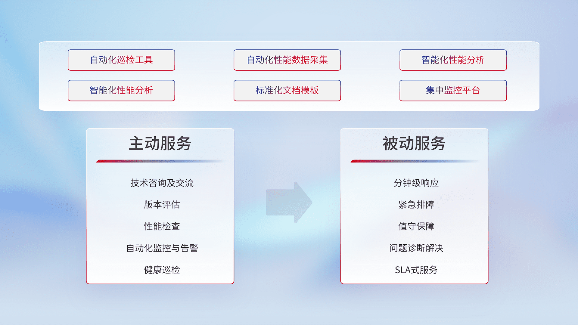 智能化工具和标准化文档,,保障服务质量,,,,提供主动服务(包含技术咨询、、、版本评估、、性能检查、、自动化监控与告警、、、、健康巡检)和被动服务包含(分钟级响应、、、紧急排障、、值守保障、、问题诊断解决、、SLA服务)。。。。